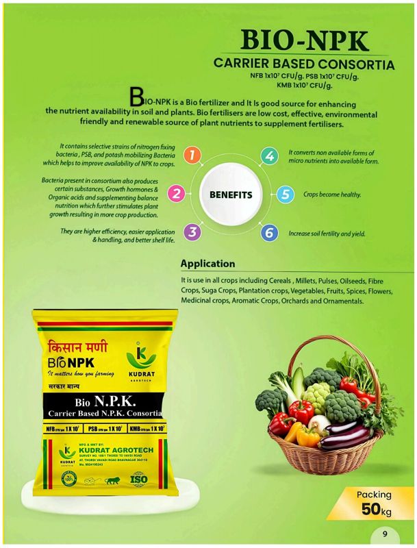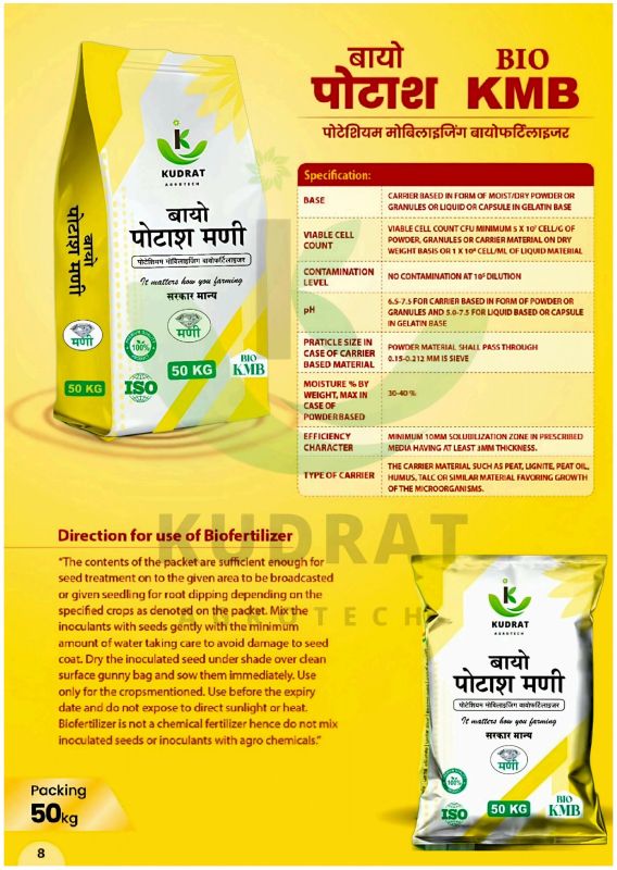 We offer a high-quality Bio Kmb Potassium Mobilizing Granular Biofertilizer in brown color, designed as granules for easy application. Manufactured by Kudrat Agrotech, this biofertilizer comes in a 50 Kg plastic bag, suitable for all types of crops. It is specifically formulated for potassium mobilization in soil, promoting healthy plant growth and increased crop yield. Ideal for farmers and gardeners looking to enhance soil fertility and plant nutrition. Trust in our biofertilizer to provide your crops with the essential potassium they need for optimal development.